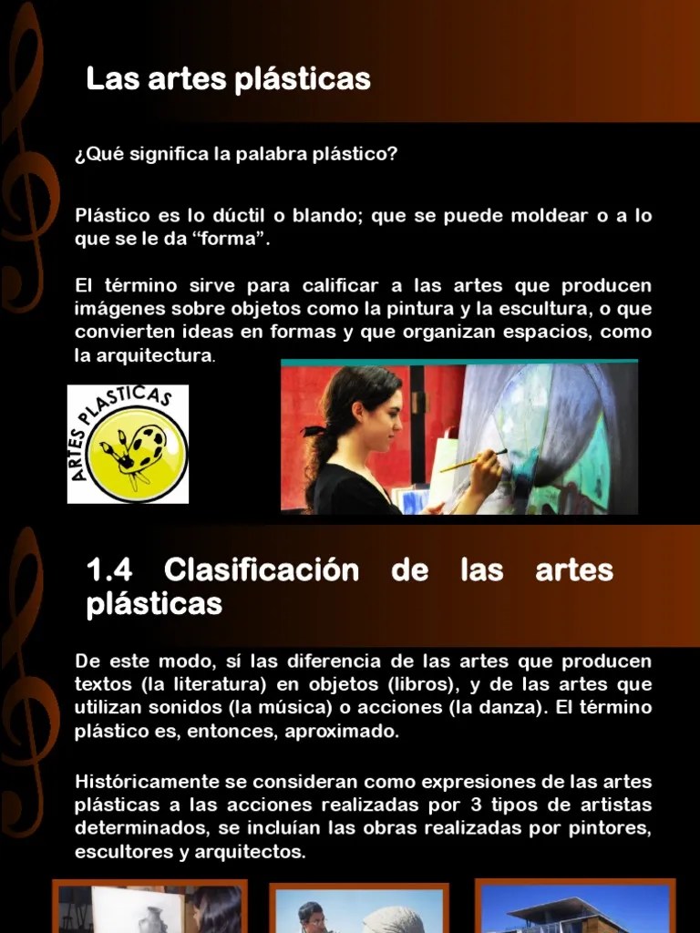 A sikringbp y otros 11 usuarios les ha parecido útil esta. Las arte plásticas tradicionales se clasifican en dos grande grupos. Artes visuales del siglo xx: Para pintar se usan materiales como: Tono o matiz propiedades del color combinacion de colores primarios armonia cromatica Fotografía, cine, arte cinético, arte abstracto, land art (arte con la tierra o el suelo mismo), arte urbano, grafiti, performance. Pintura, escultura, arquitectura, dibujo, grabado. Las arte plásticas tradicionales se clasifican en dos grande grupos: