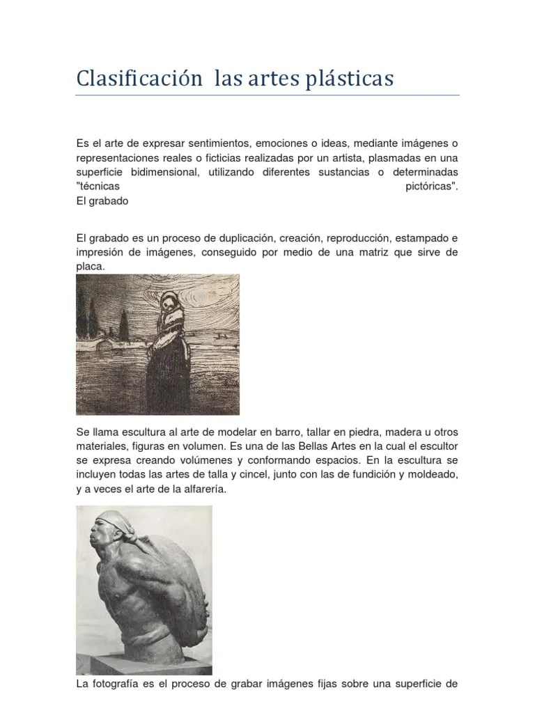 Las artes plásticas se clasifican en:. Tridimensionales, éstas son las que dependen esencialmente del espacio, es decir las que aparte de largo y ancho tienen profundidad. Están integradas por largo y ancho, éstas son dibujo, grabado y pintura. A sikringbp y otros 11 usuarios les ha parecido útil esta. Artes visuales del siglo xx: Las artes plásticas se clasifican en: Bidimensionales, las que se efectúan sobre una superficie plana;. Para pintar se usan materiales como: