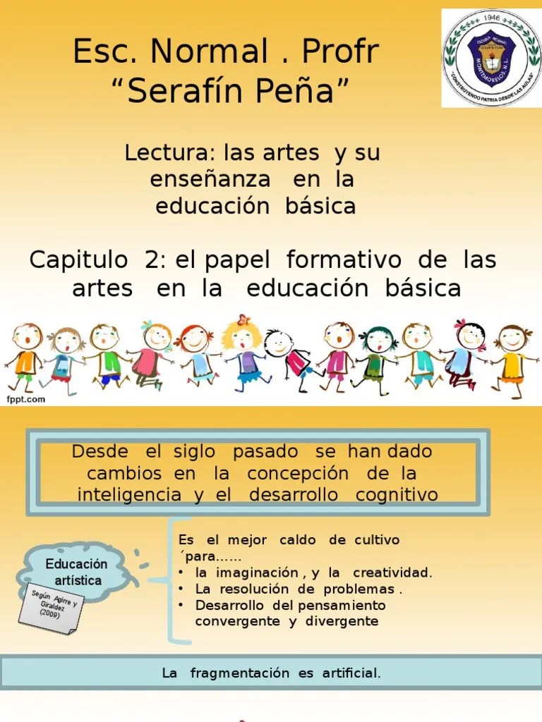 De este modo, se admite implícita y explícitamente que en la educación artística, ni se trata de preparar a todos los alumnos de.. • obtengan los fundamentos básicos de las artes visuales, la expresión corporal y la danza, la música y el teatro para continuar desarrollando la competencia artística y cultural, así como favorecer las competencias para la vida en el marco de la for mación integral en educación básica. La educación en artes dentro de los sistemas educativos sigue siendo un reto en la mayoría de los países. Los mitos que rodean al arte mismo en el.. Como los años fueron pasando se noto como las instituciones donde he estado hacen al arte a un lado, para mí debería ser incluso igual de importante que las demás materias pues hacen que la mente se libere & pensemos por si mismos librandonos del estrés & en muchas ocasiones hacer que me sienta bien en la institución cosa que las demás materias matan en mi, no somos máquinas pero así.